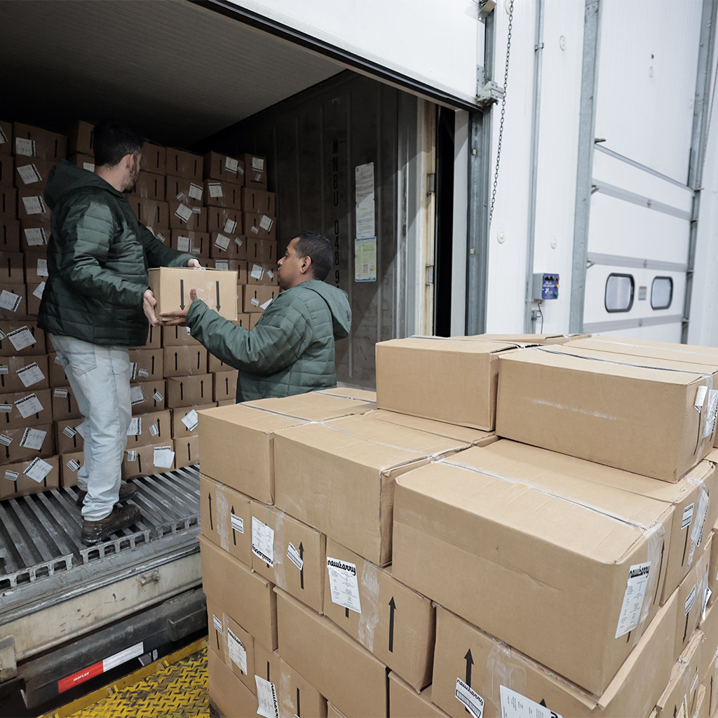 Temos o cuidado para que os produtos sejam organizados cuidadosamente dentro do baú para que a circulação de ar refrigerado não seja prejudicada durante a distribuição.